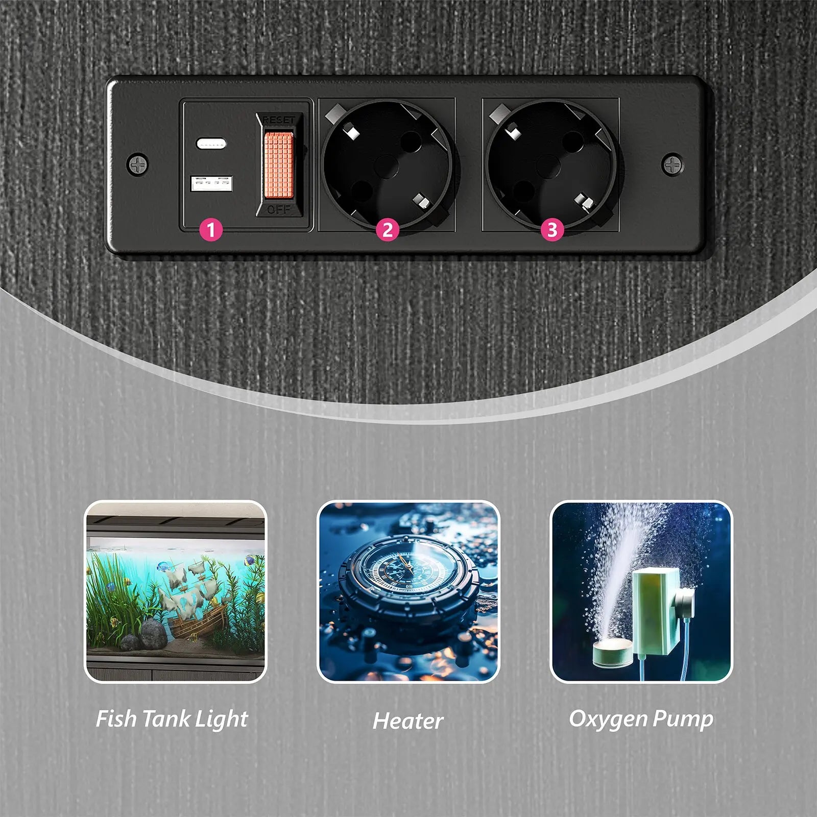 - Multi-function power supply You have two AC sockets, one USB, and one Type-C port, plus a switch to power pumps, lights, or filters with ease.