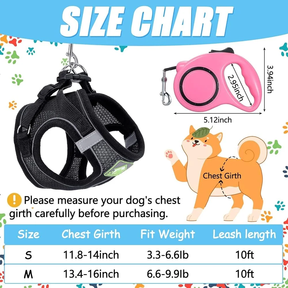 - All-in-one set: includes 2 vest harnesses, 2 retractable leashes, and 2 bowknot collars with bells in black and pink, sized for chest 11.8–14 inches and weight 3.3–6.6 lb.