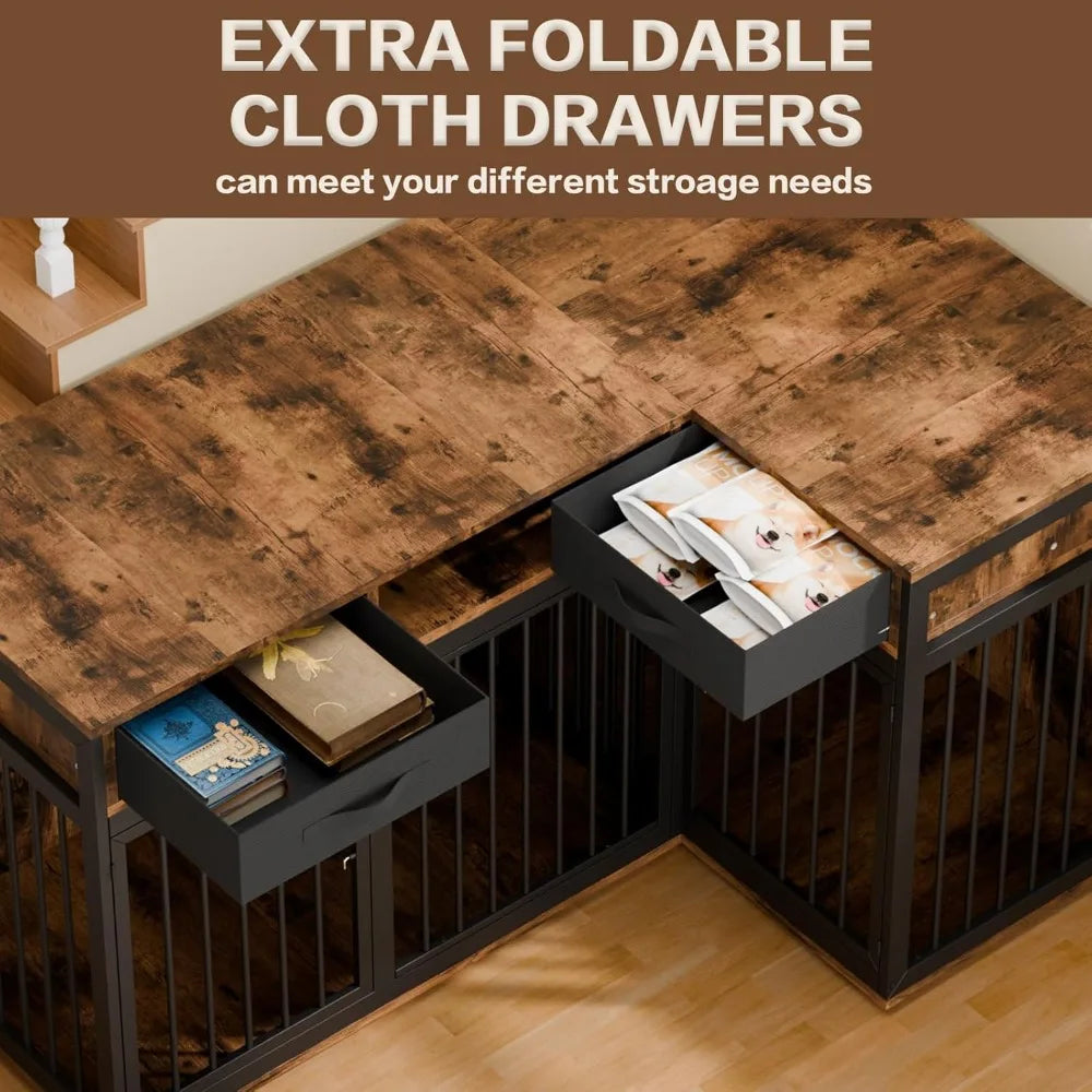 - 【EXTRA STORAGE SPACE】Besides the 85.4"*24.4" desktop storage space,large double dog crate furniture comes with 2 foldable fabric drawer organizers,which is made from non-woven fabric and hard cardboard,maximizing space utilization to help organize,also have 2 large open drawers,can meet your different stroage needs!