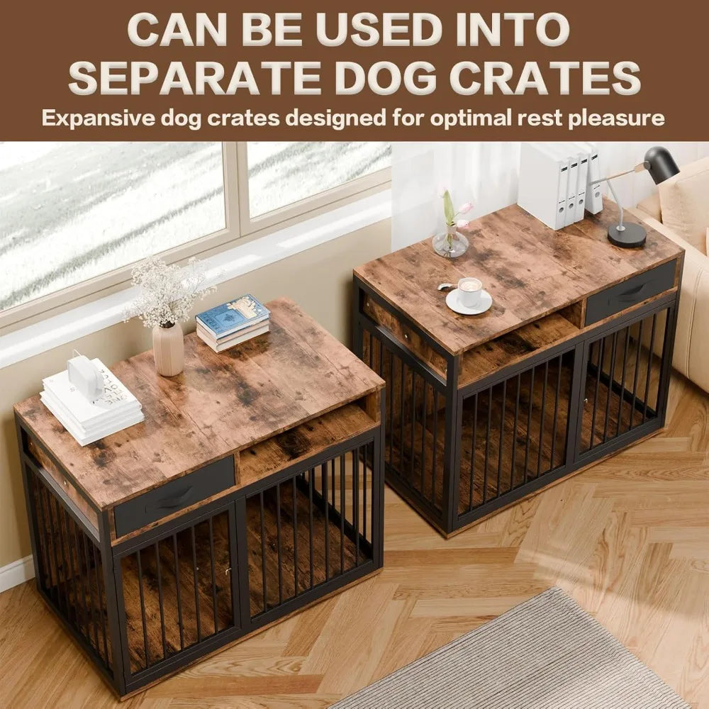 - 【OVER 6 COMBINATIONS】This metal frame furniture style dog crate can become a unique L-shaped corner dog crate,also be separated into two completely independent dog kennels,and can be combined side by side to form a extra large dog crate furniture.Meet the needs of different areas in your home!
