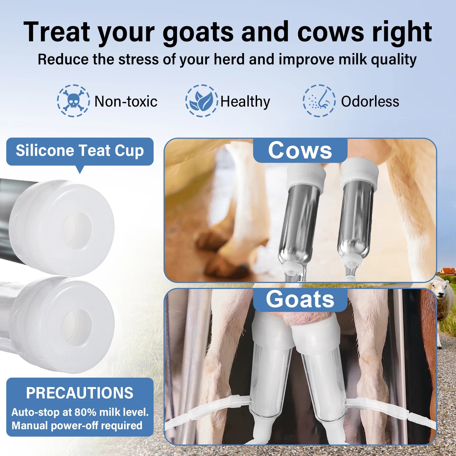 - You get a comfortable massage and safe milking experience for cows and goats, thanks to the upgraded, adjustable suction, plus a gentle massaging action that helps reduce stress during milking.