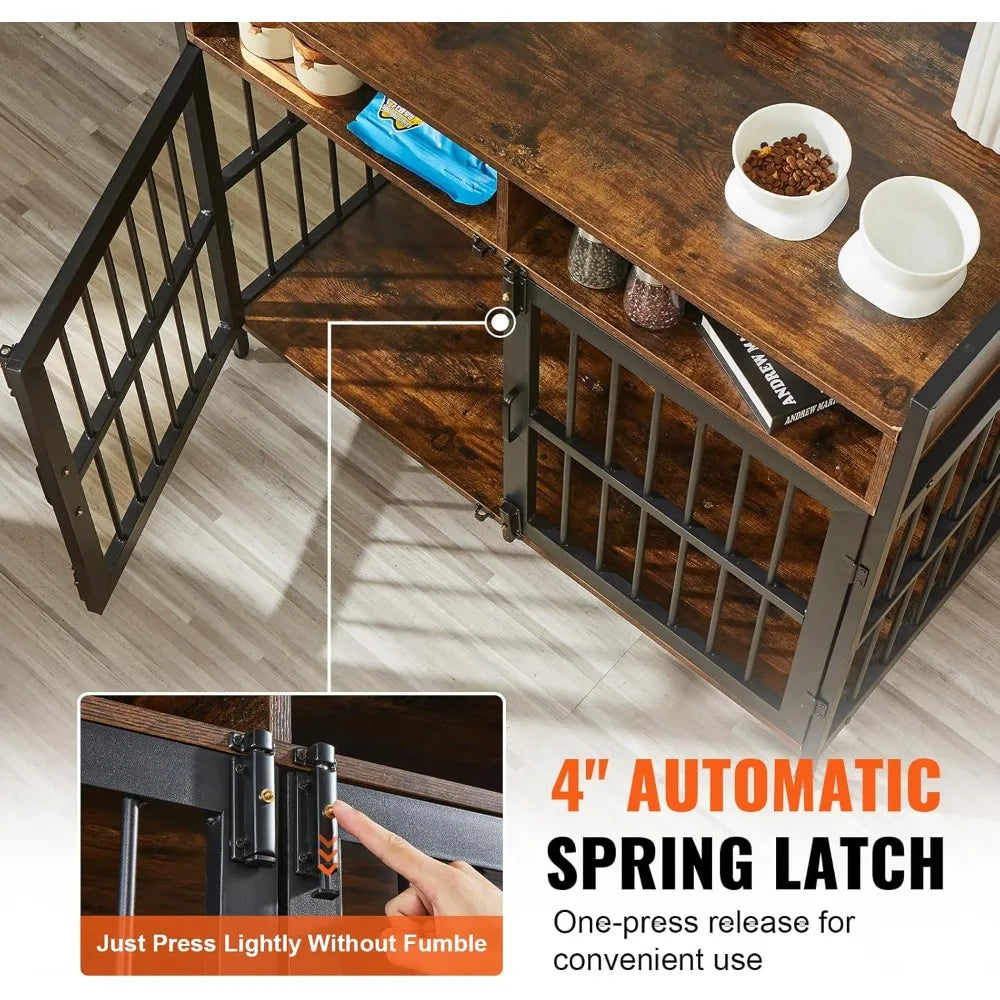 - Dual-Door Design: The double-door design creates a space for your pet to enter and exit freely, making their daily life more convenient. Our furniture dog crate features durable automatic spring latches for smooth openings and closures. This enhances your pet-raising experience.