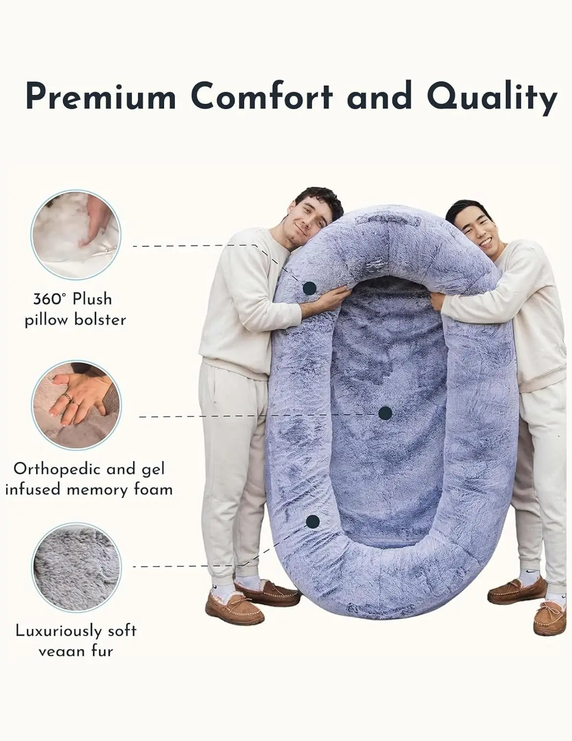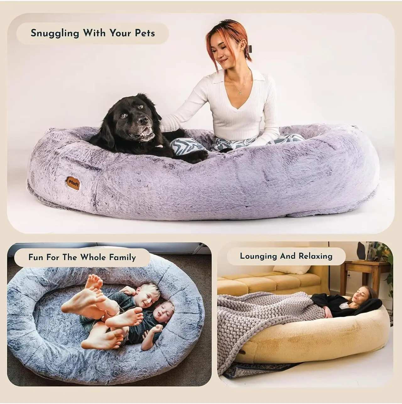 - Generous 68in x 33in base with a plush vegan-fur exterior offers plenty of space for fully stretched lounging or cozy corners for kids and adults.