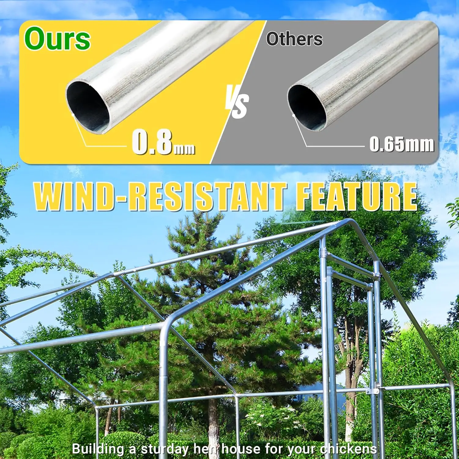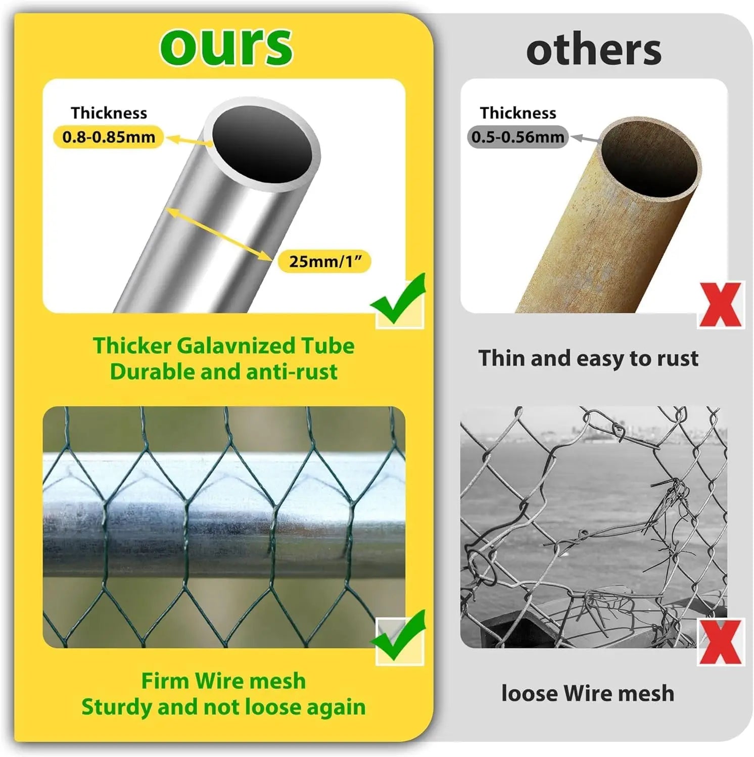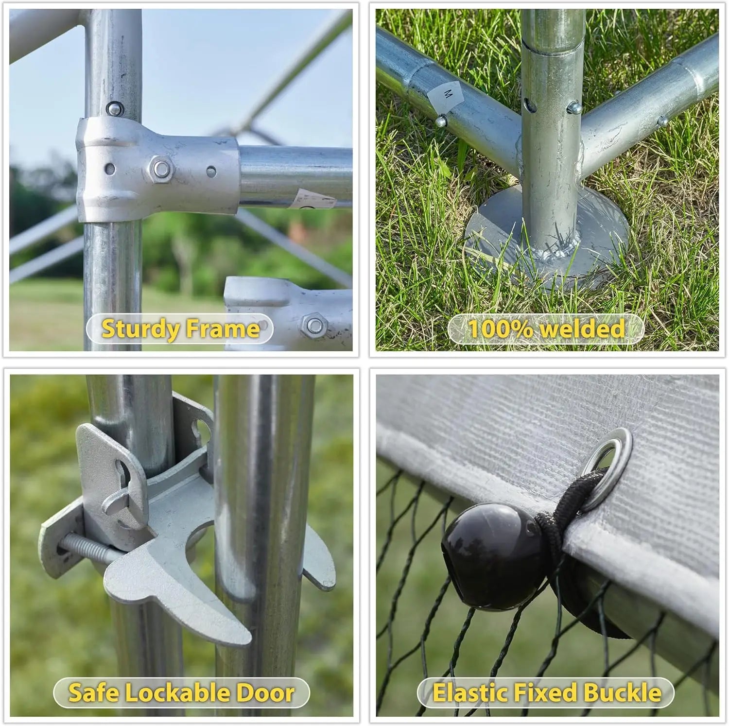 - Durable galvanized steel frame with 0.8mm thick tubes and 25mm diameter, plus PVC-coated hex mesh; fully welded construction and hot-dip galvanization for long-lasting rust resistance.