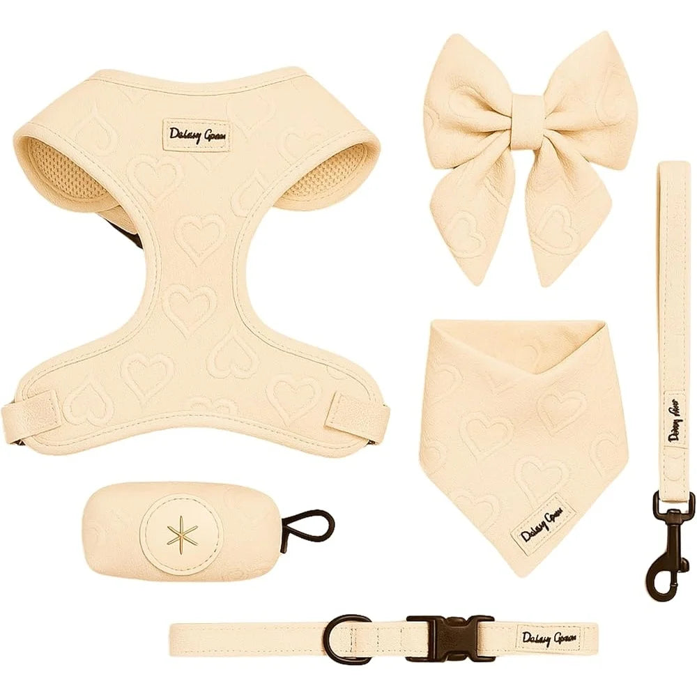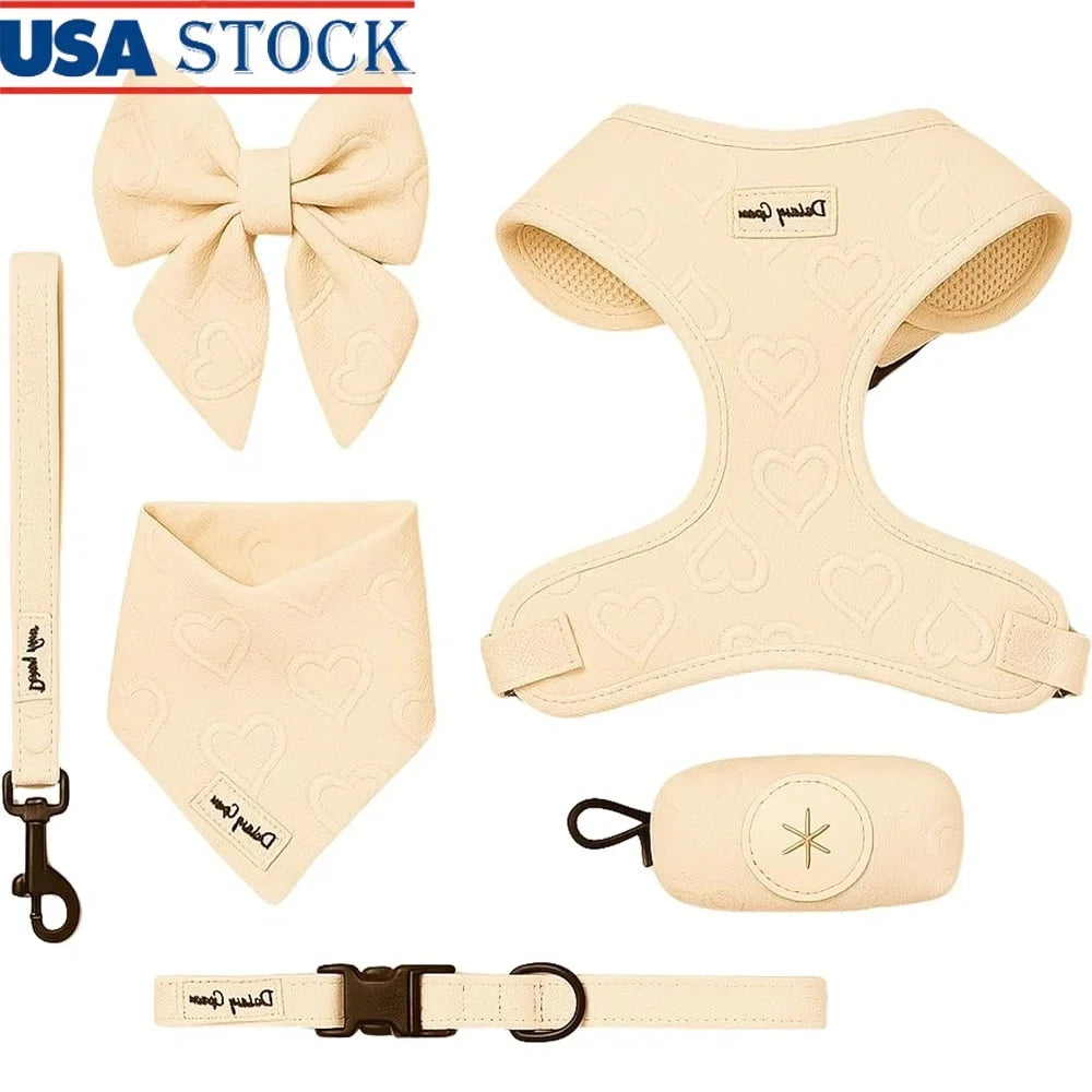 Medium Dog Harness Set No Pull Matching Leash Collar Bow Bandana Poop Bag Holder Breathable Mesh Hearts