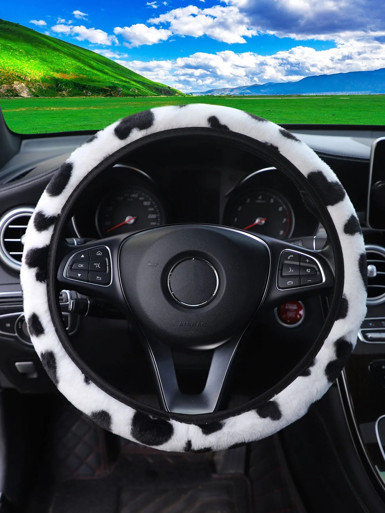 Turn chilly drives into cozy, eye-catching moments with this plush cow-print steering wheel cover that softens every grip.