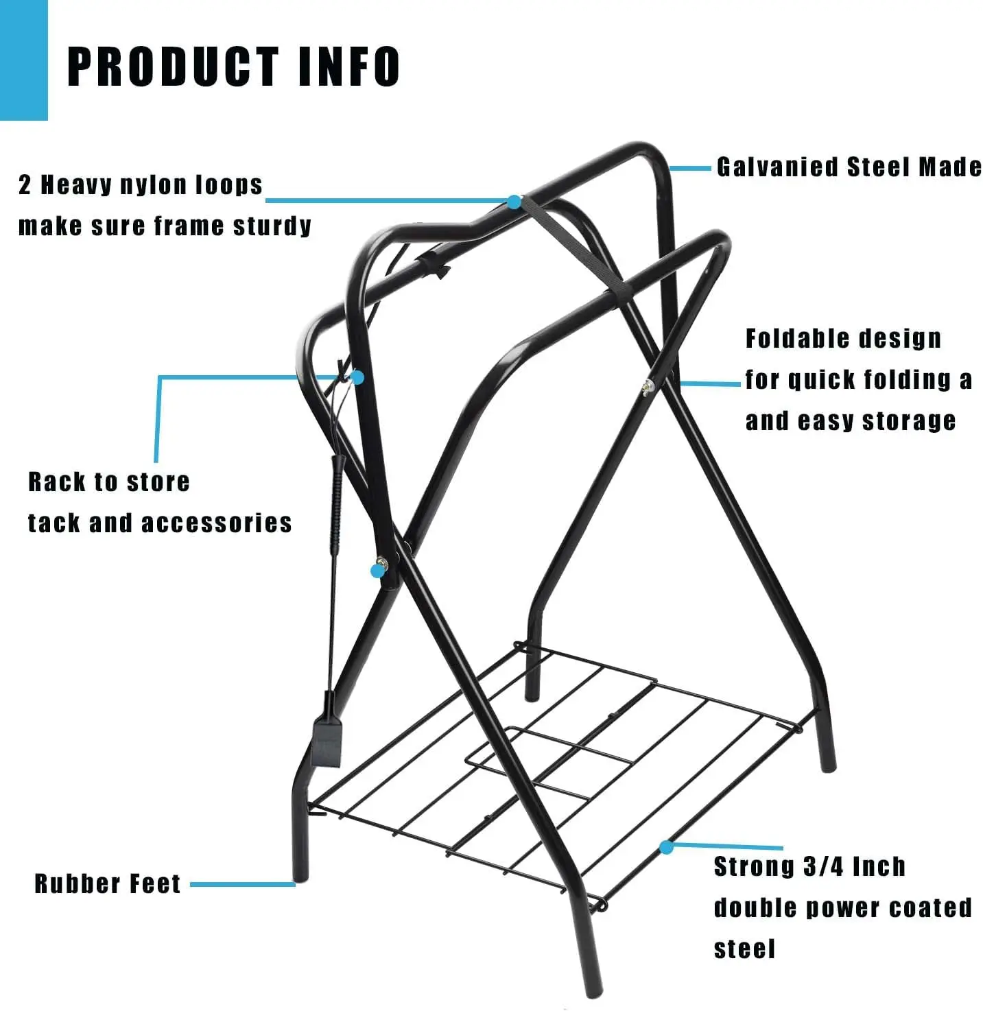 - Durable construction: heavy-duty steel with a double powder-coated finish resists rust and bending; broad, stable base stays upright even with heavy saddles and is easy to wipe clean.